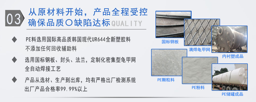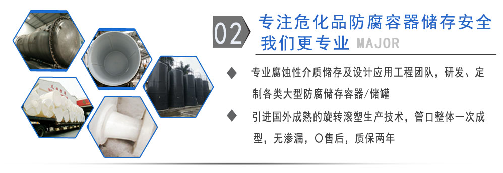 公司有鋼襯塑PE/PO、PE全塑、碳鋼、不銹鋼四大系列100多個品種,專注于常壓儲存容器生產,其產品包括鋼襯塑儲罐管口一體成型PE儲罐、碳鋼儲罐不銹鋼儲罐、反應釜、攪拌罐、離子交換柱、鋼襯PE/PO儲罐、塑料儲罐、鹽酸儲罐、硫酸儲罐等等。更大限度滿足廣大客戶的各種需求,同時可以根據客戶的需要加工定制各種防腐設備。
